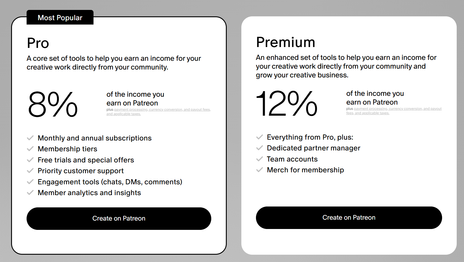 Patreon提供的會員訂閱服務看似無成本,但實際上卻有5-12%的抽成。以下是Patreon的主要方案: